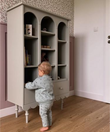 W kontekście przechowywania oznacza to, że preferowała półki i szafki, z których dziecko samo może sobie wziąć wybraną rzecz, bez konieczności proszenia dorosłych o pomoc. Szafa Bloom, przez którą “widać’ umieszczone w niej pudełka czy zabawki, to przykład takiego mebla.